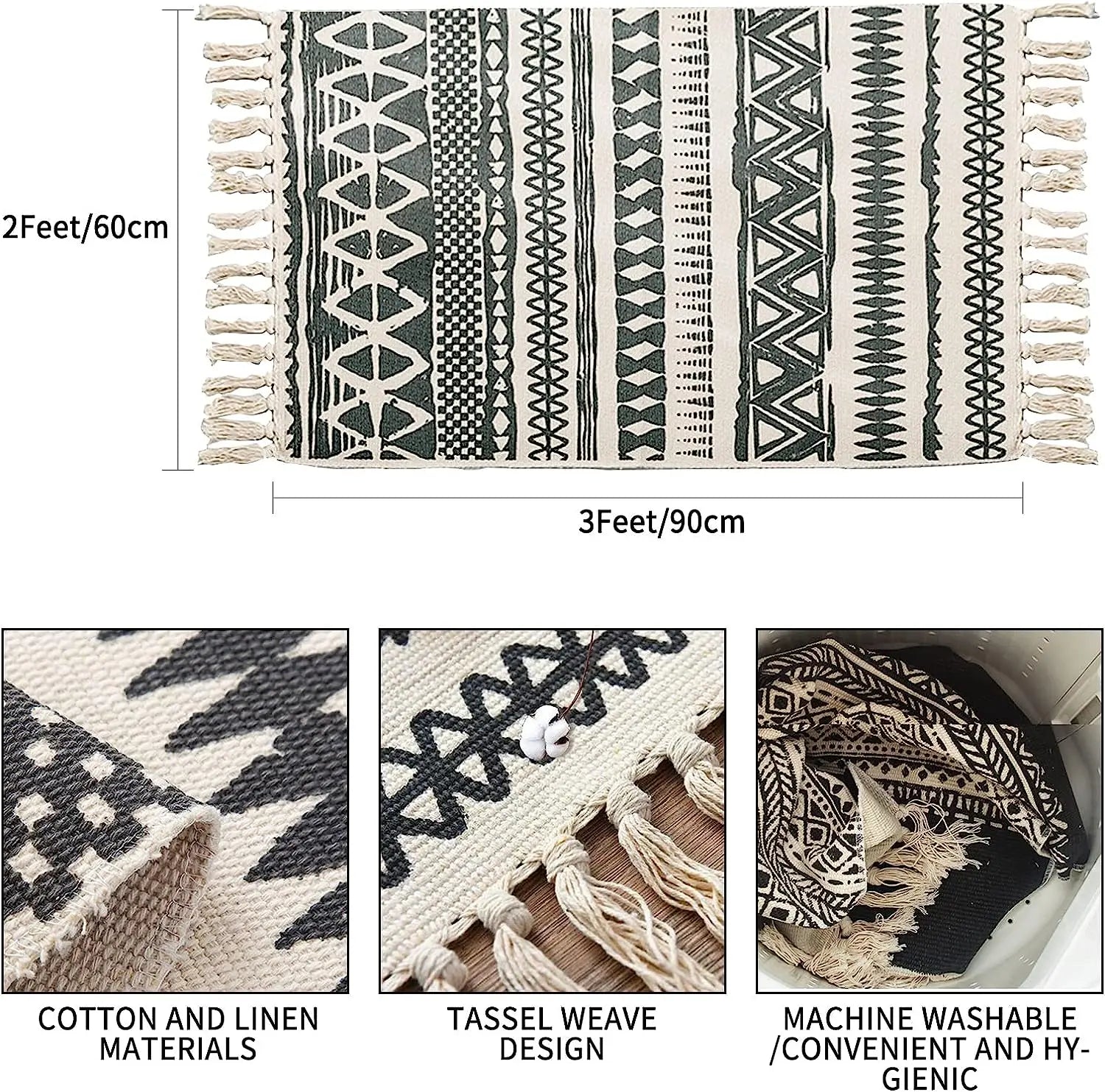 Durable Cotton material: High-quality BOHO area rug is made of 45 % cotton + 45 % polyester + 10% viscose hand cotton woven rug, water-absorbent, and very durable. Natural, soft, abosorbant and beautiful!